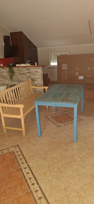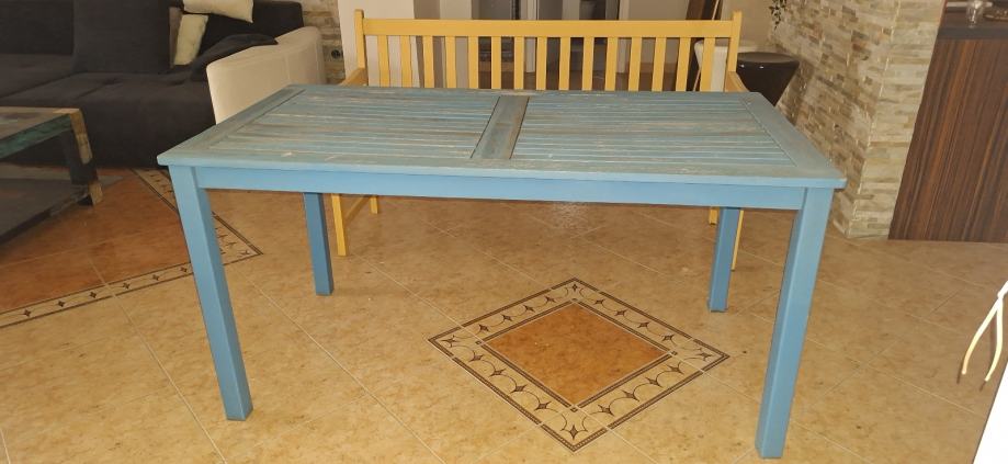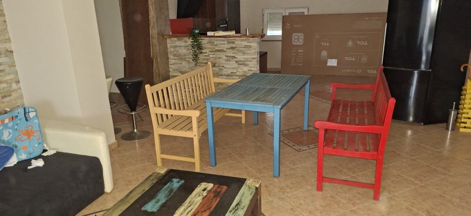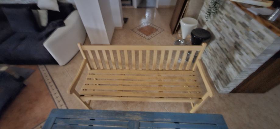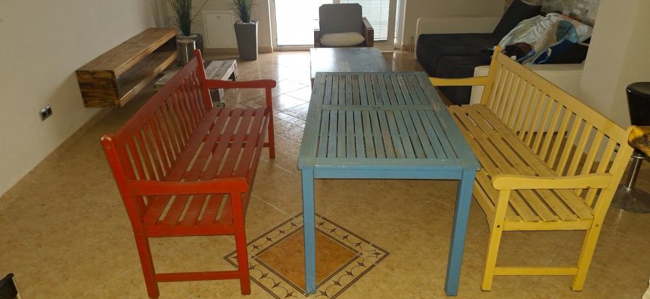 Stol sa 2 banka za vani u veselim bojama u dobrom stanju moze i sa kusinima