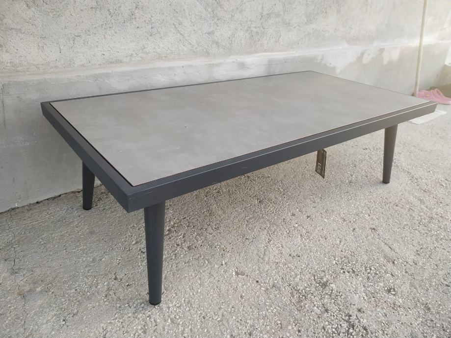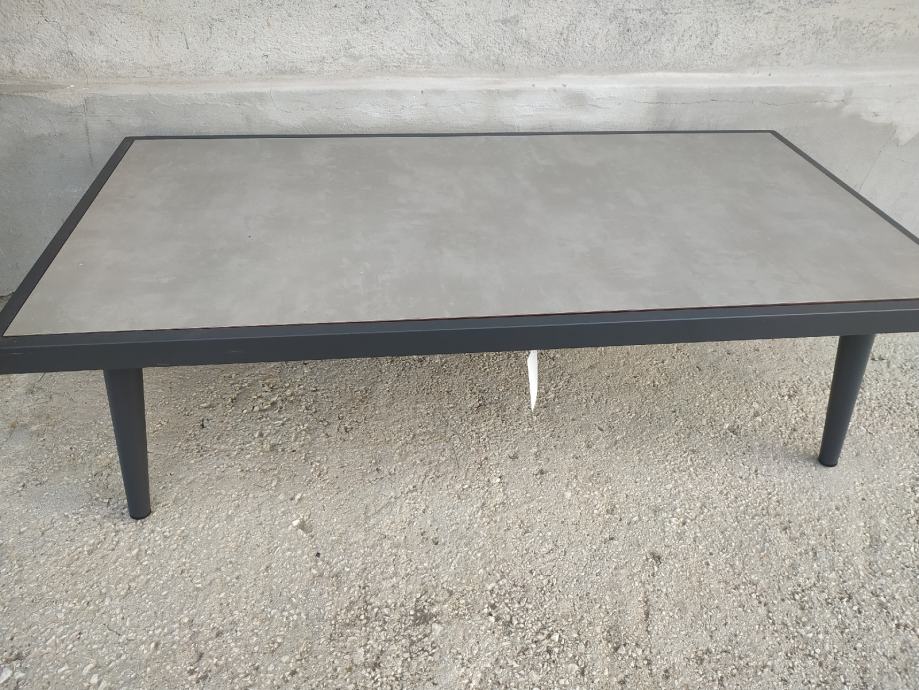 Novi niski stolić za balkon/vrt. Dimenzije 120*60. Konstrukcija aluminijska boje antracit, compact ploča otporna na sve vremenske uvjete.
