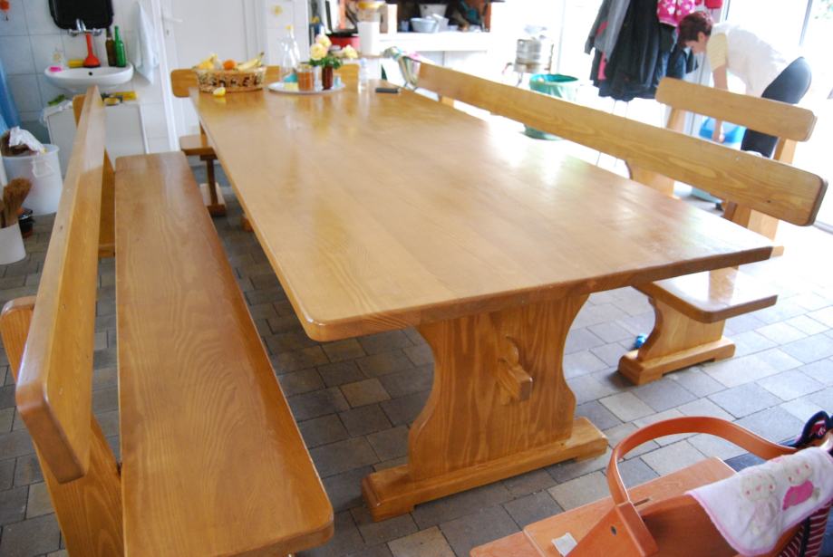 Stol sa 4 klupe.Stol je dužine 3 metra isto kao i dvije klupe a dvije čeone klupe su dužine 112 cm. Stol je širok 112 cm debljina 45 mm.