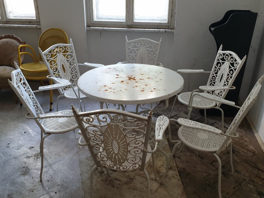 Stol je malo hrđav trebalo bi ga uredit.Plastike na stolcima su čitave.