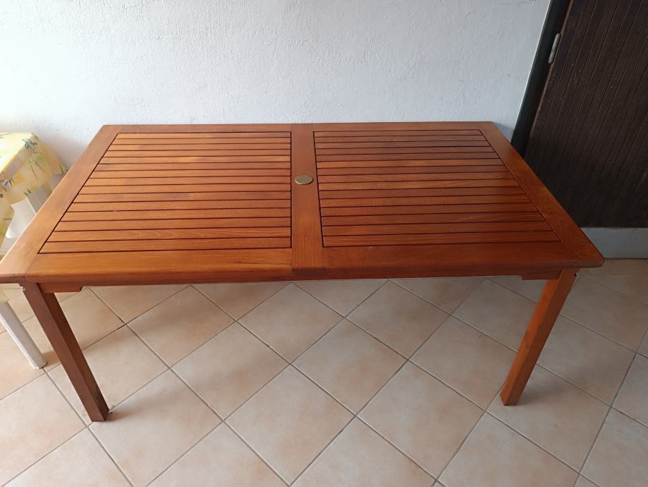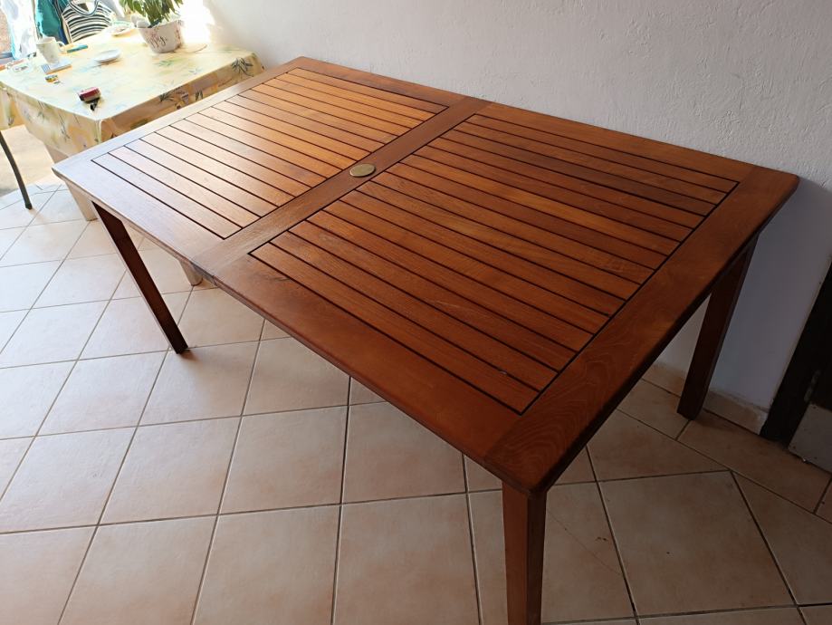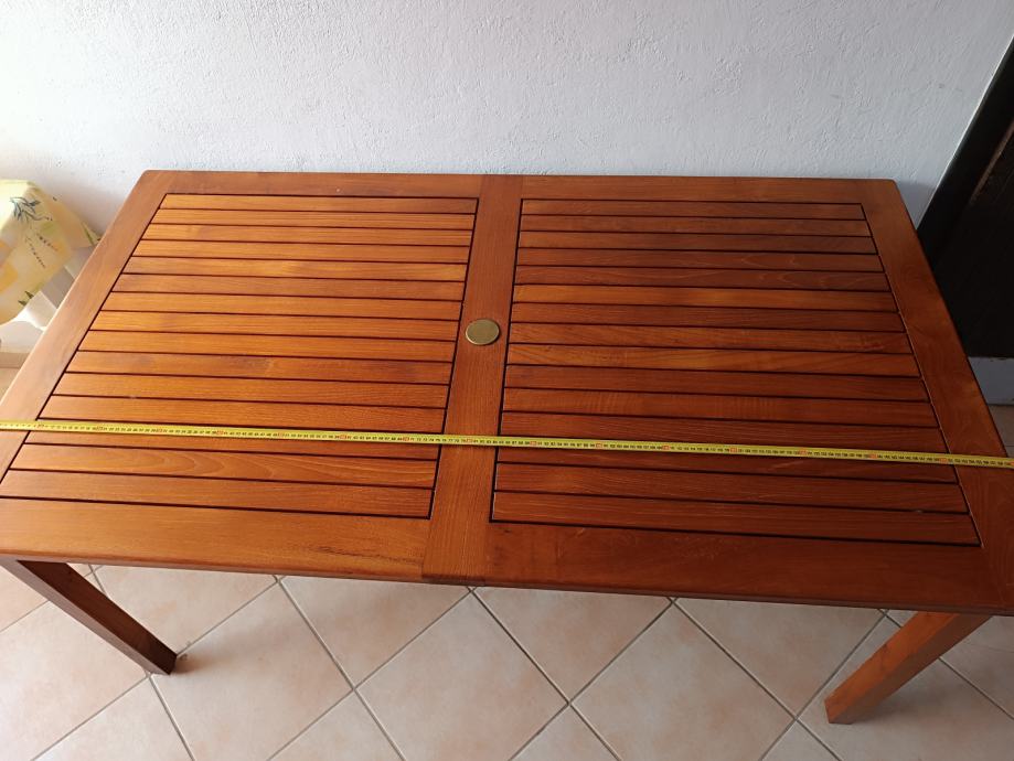 Potpuno novi nekorišteni stol + 6 stolica od tikovine s novim, kvalitetnim jastucima još u najlonima.