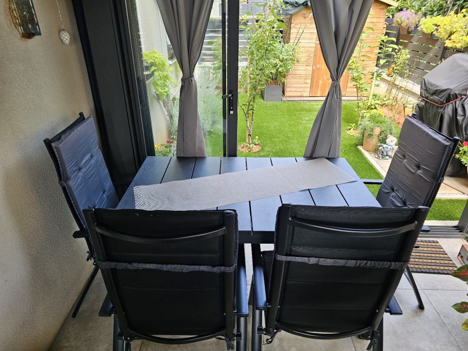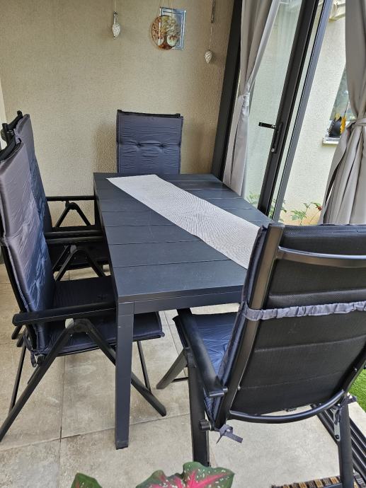Prodaje se aluminijski produžni stol 140/210 sa 85 ,antracit boje,za sve vrste ambijenta.Uz njega se prodaju i 8 aluminijskih textilen stolica,antracit boje.Pojačane,podesive u 7 razina, sklopive.Sve je vodootporno.Prodaje se isključivo kao komplet.Razlog prodaje je samo manjak mjesta ispod bio pergole.Korišten je uglavnom za slaganje stvari.
