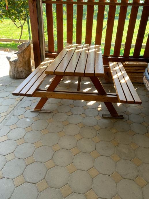 Stol sa dvje klupe Hrastov 180 cm x 180 cm debljina daske 5 cm stol iklupe mogu se staviti u dvorište voćnjak ili uz parking da ljudi mogu sjesti i odmoriti
