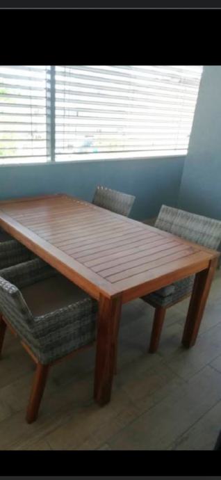 Prodajemo predivan stol od tikovine za terasu + 4 stolice od pravog ratana i nogama od tikovine (sa jastucima po mjeri). Stol i stolice su jako kvalitetni i vrlo kratko korišteni te je tikovina zaštićena tankim premazom od lanenog ulja.