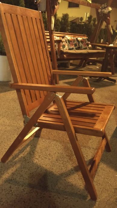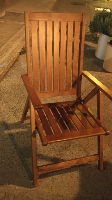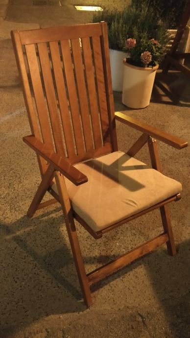 Stolice za terasu, 8 komada, pogodne za kafiće, vrt ili terase. Nove, čvrste i izrađene od kvalitetnog drveta Sklopive i podesive u tri položaja, sa jastucima, Prodajem za 300 kuna po komadu