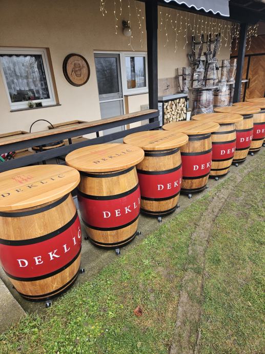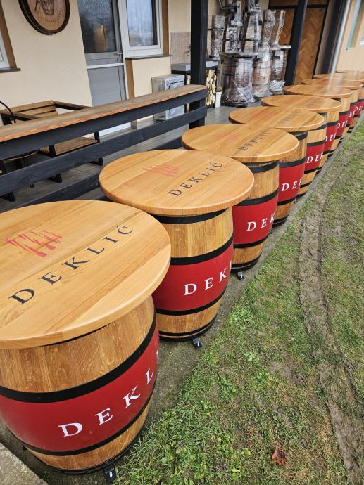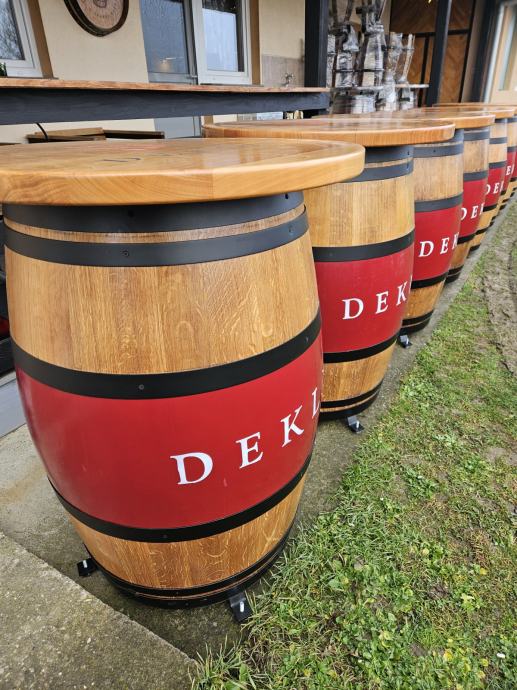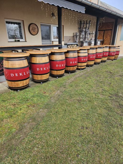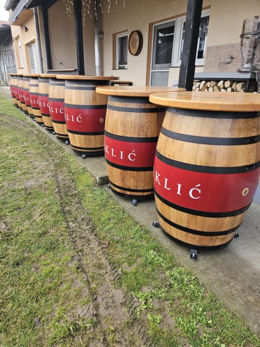 Hrastove barikne bačve 225l, brušene, bojane po želji, plastificirani obruči. Moguć logo i gravura na ploči po želji.