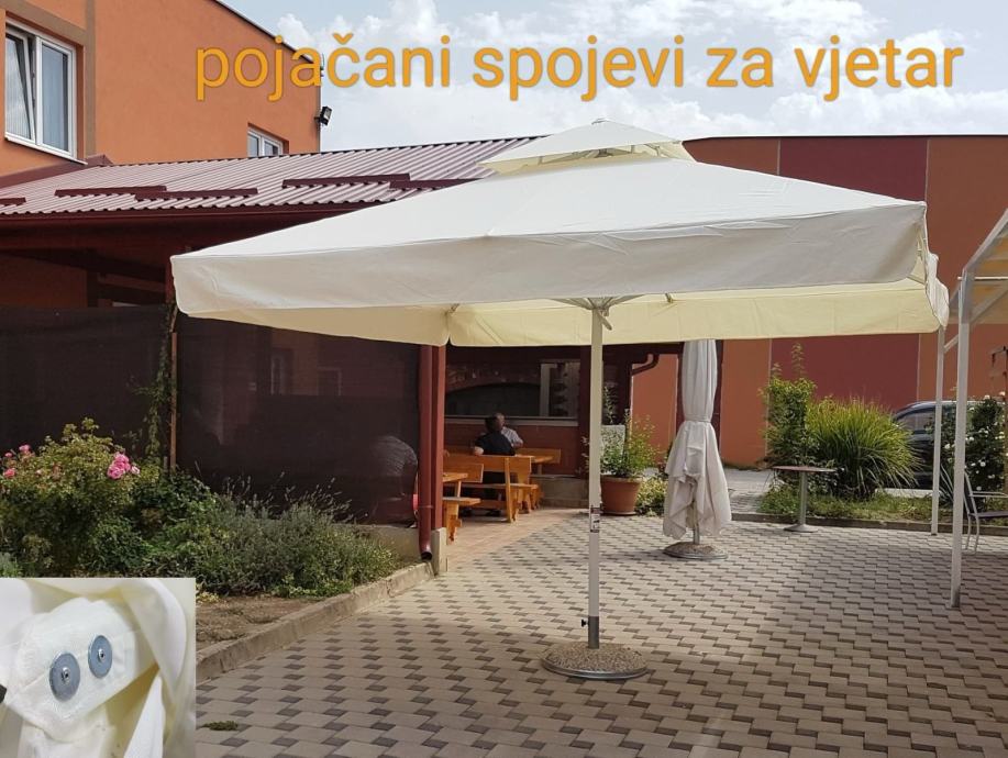 3.5*3.5 visoki sa betonskim stalkom, okrugli. Može se postaviti tako da se stol ne treba micati. Dupli krov. Platno bež boje