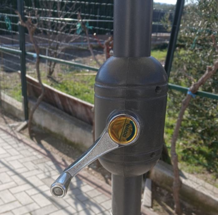 Ima okretnu ručicu za podizanje i spuštanje.