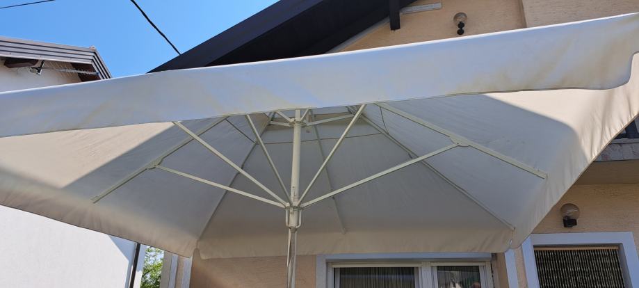 Prodajemo suncobran malo koristen 3,5 x 3,5 m bež boje zajedno sa betonskim postoljem.