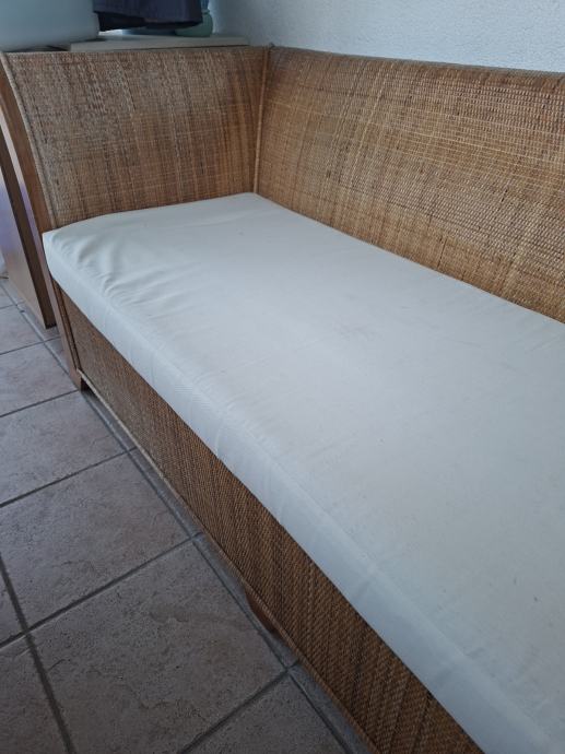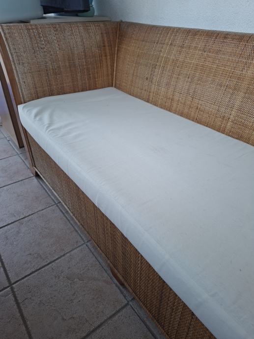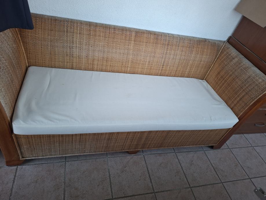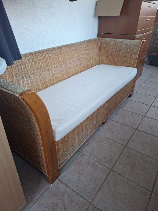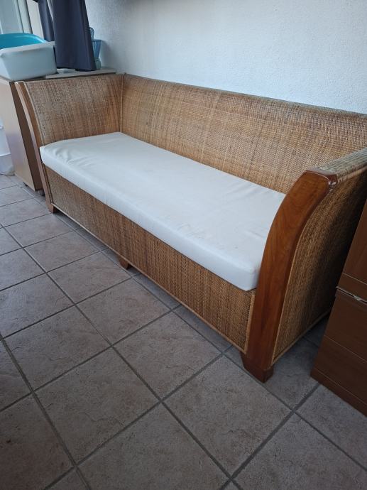 Prodajem trosjed namijenjen za vanjsku upotrebu, izrađen od prirodnog ratana s drvenim naslonima za ruke. Dolazi s bijelim jastukom za sjedenje. Čvrsta i stabilna konstrukcija