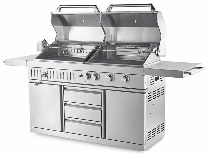 Opremljen je s 3 jaka plamenika, infracrvenim sustavom, Piezo električnim paljenjem, robusnim upravljačkim gumbima, LED osvjetljenjem i ugrađenim svjetlima u kutiji za kuhanje.