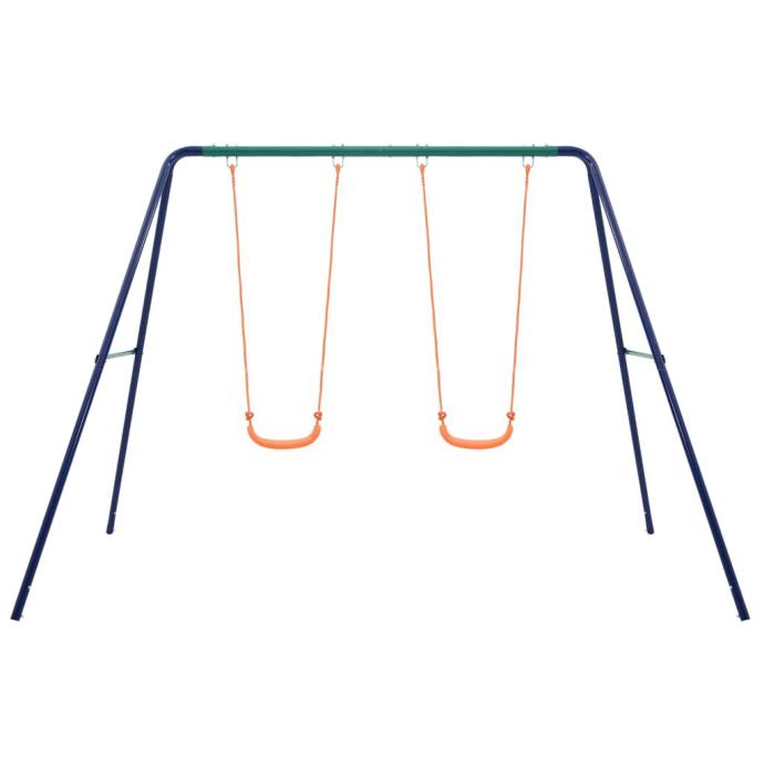 Ovaj set za ljuljanje sastoji se od čvrstog metalnog A-okvira s 2 pojedinačna sjedala za ljuljačku. Zahvaljujući čvrstom čeličnom okviru i plastičnim sjedalima, set je iznimno izdržljiv i otporan na vremenske utjecaje. Također se jednostavno sastavlja. Sve ljuljačke sigurno su pričvršćene na čvrste prečke A-okvira pomoću snažnih vijaka, kuka i užadi.