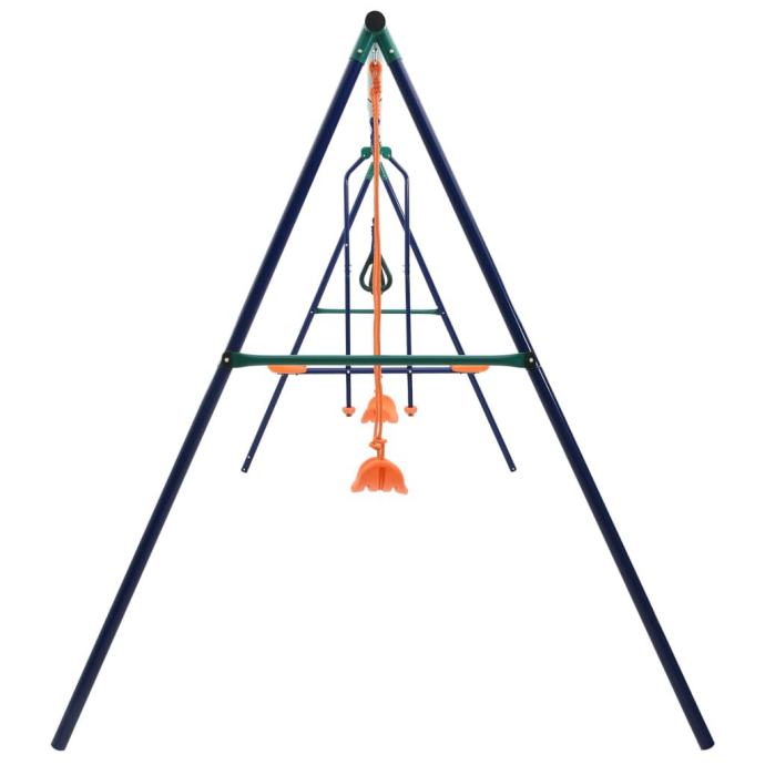 Ovaj set ljuljački sastoji se od čvrstog čeličnog okvira u obliku slova A s 2 jednostruke ljuljačke, 2 gimnastičke karike i jednom klackalicom. Klackalica je prikladna za dvoje djece istovremeno. Zahvaljujući čvrstom čeličnom okviru i plastičnim sjedalima, ovaj set iznimno je izdržljiv i otporan na vremenske utjecaje. Također se jednostavno sastavlja. Svi dijelovi sigurno su pričvršćeni na snažnu prečku okvira u obliku slova A pomoću čvrstih vijaka, kuka i užeta.