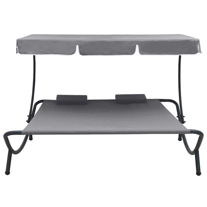 Napravljen od tkanine oxford otporne na vremenske utjecaje, ležaj za sunčanje može se upotrebljavati na otvorenom tijekom cijele godine. Okviri od čelika obloženog prahom pružaju veliku stabilnost i izvrsnu izdržljivost. Jastuci i krov, napravljeni od vodoodbojnog poliestera, nesumnjivo će pružiti najveću moguću udobnost tijekom ležanja. Ležaj za sunčanje za dvije osobe pruža vam hlad zahvaljujući svom velikom krovu.