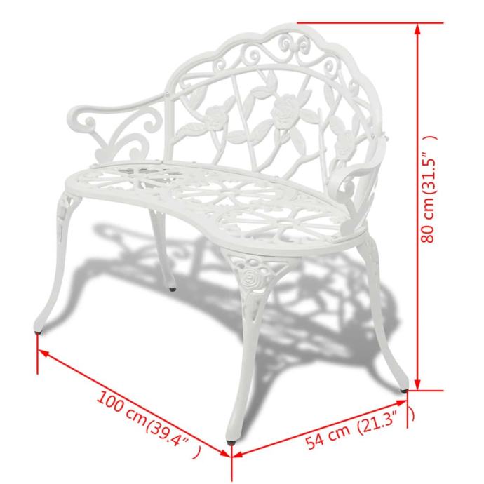 Napravljena od visokokvalitetnog lijevanog aluminija, ova vrtna klupa otporna je na vremenske uvjete i vrlo izdržljiva. Noge od lijevanog željeza doprinose njenoj čvrstoći. Detaljne rezbarije i ljupki cvjetni uzorak dodaju elegantan naglasak svakom vrtu ili vanjskom prostoru. Ova klupa za park prikladna je za 2 osobe.