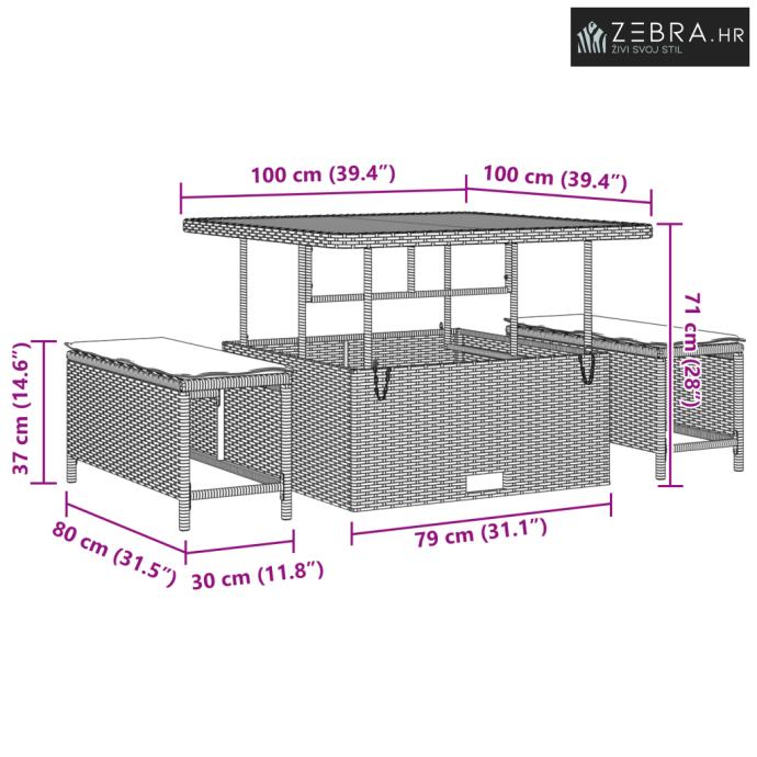 Sastav materijala: Set je napravljen od kvalitetnog poliratana koji je otporan na vodu i nudi dobre UV zaštitu. Čelični okvir je čvrst i ugodan za oko, dok poliratan nasloni za ruke dodaju udobnost i stil.
