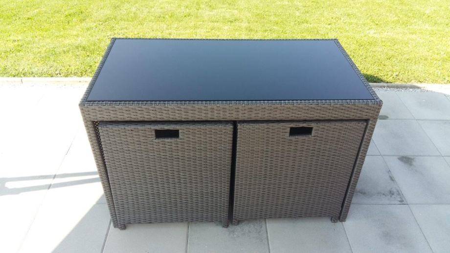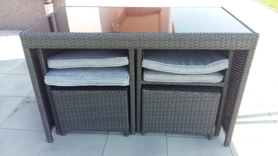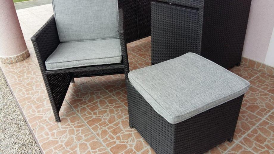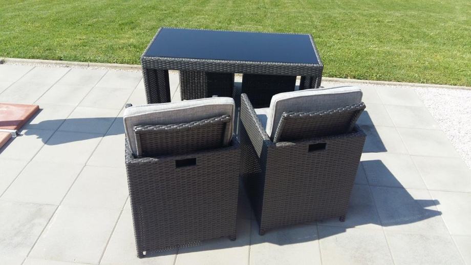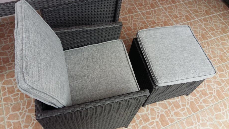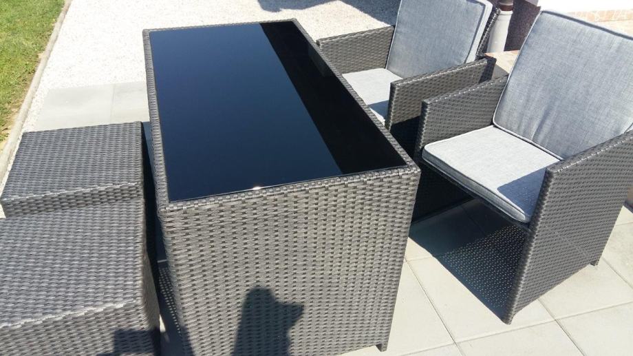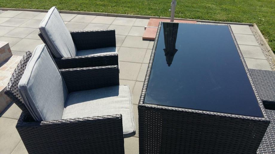 Vrtna garnitura Brooklyn, gotovo nekorištena, kao nova, boja antracit. Sjedalice i/ili leđni jastuci u sivoj boji, sa patent zatvaračem, pa se mogu jednostavno oprati, potpuno novi, nekorišteni.