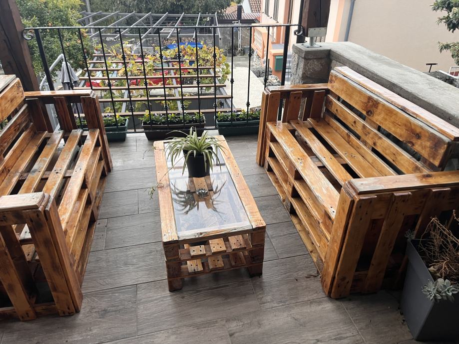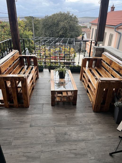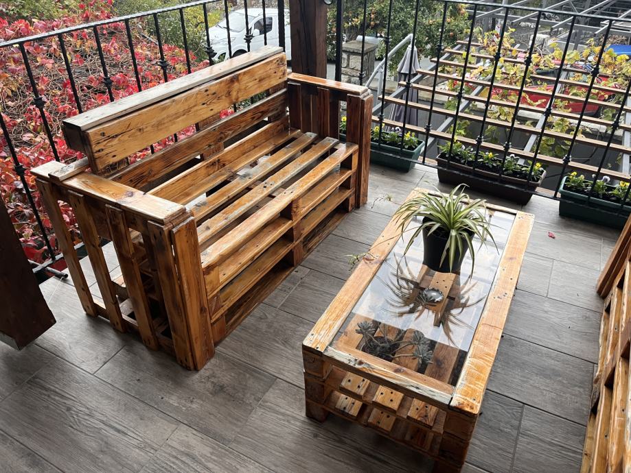 Garnitura napravljena od drvenih paleta, hoblana i djelomočno paljena zbog izgleda. Sve lakirano. Dimenzije klupa su 145*65, stol 108*52 cm. Na stolu je kaljeno staklo po narudžbi. Cijena je za komplet.