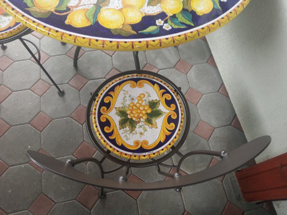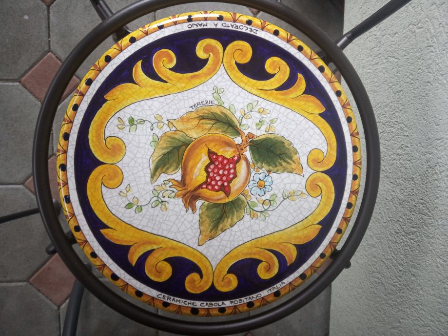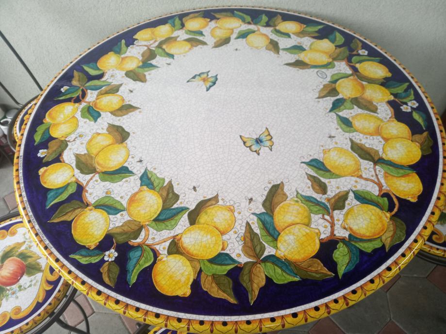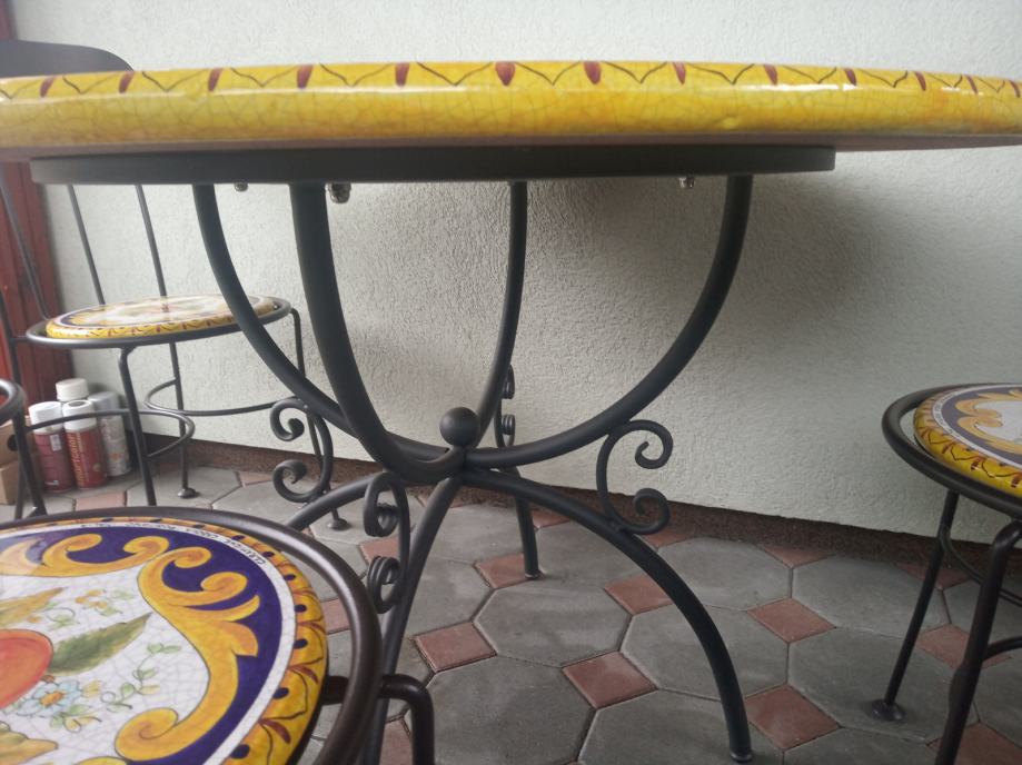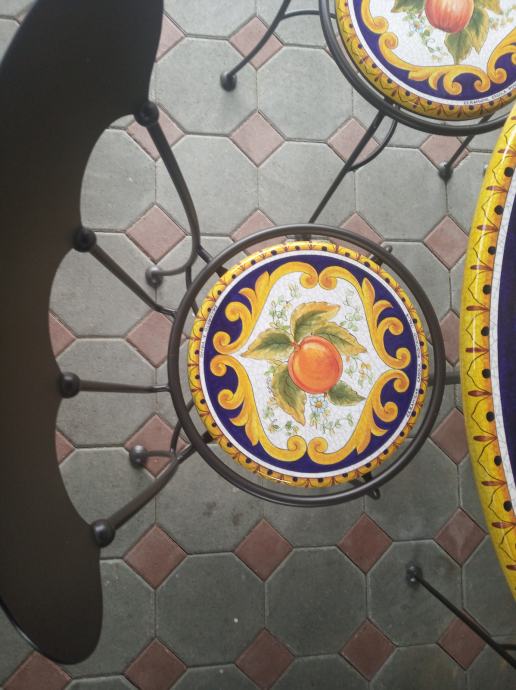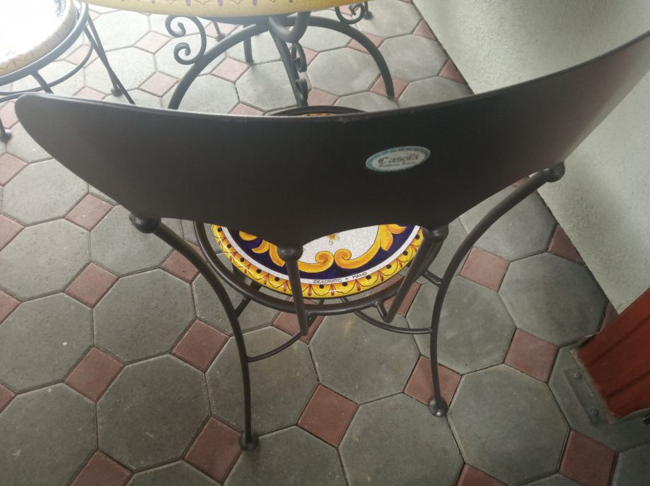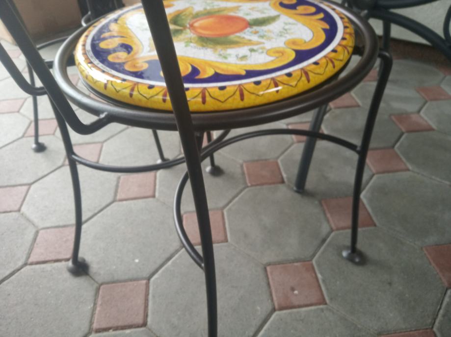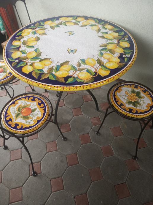 Prodajem rabljenu bez oštećenja vrtnu garnituru stol ploča promjera 110 cm i visine 75 cm metalne noge ,kamena ploča ručno oslikana i 4 stolca.