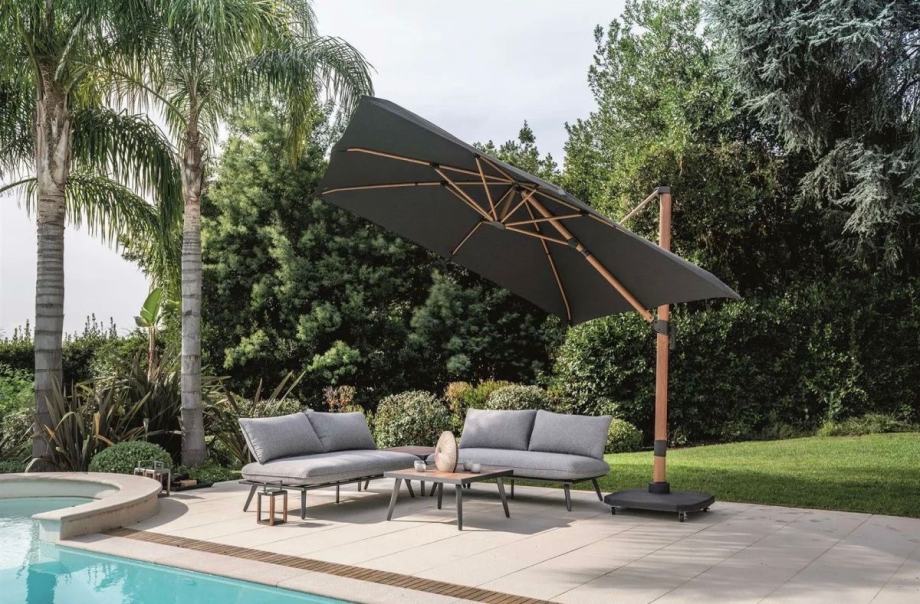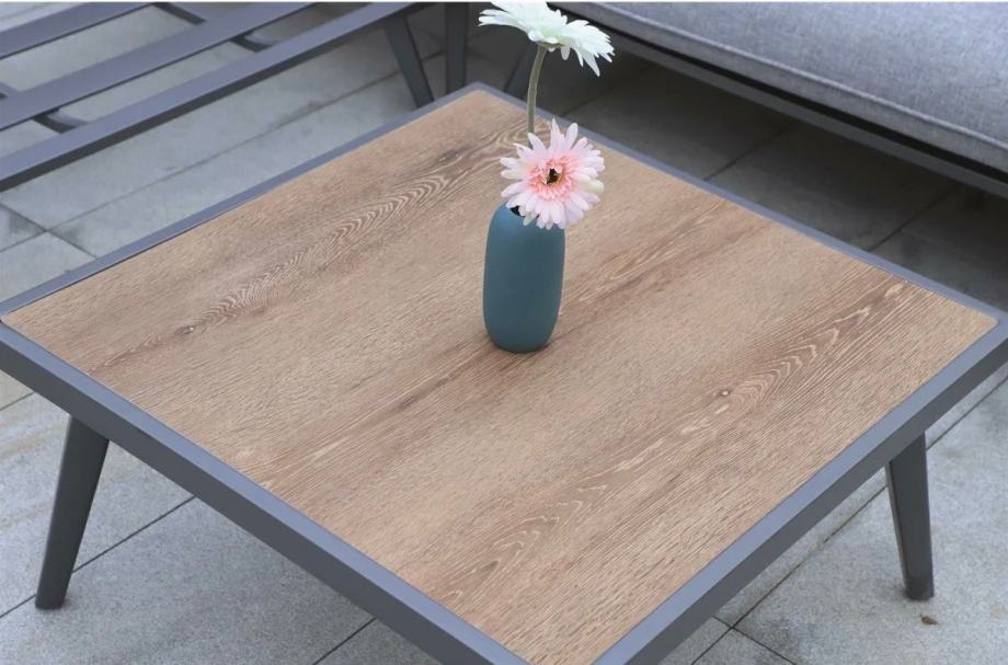 Stol: 75cm x 75 x 38cm, Garnitura od aluminija antracitne boje, koja se sastoji od dvosjeda i stolića s pločom od Krealita u boji s efektom tikovine. Kvalitetni jastuci za sjedenje i naslon izrađeni od sivog Spunpoly-a.