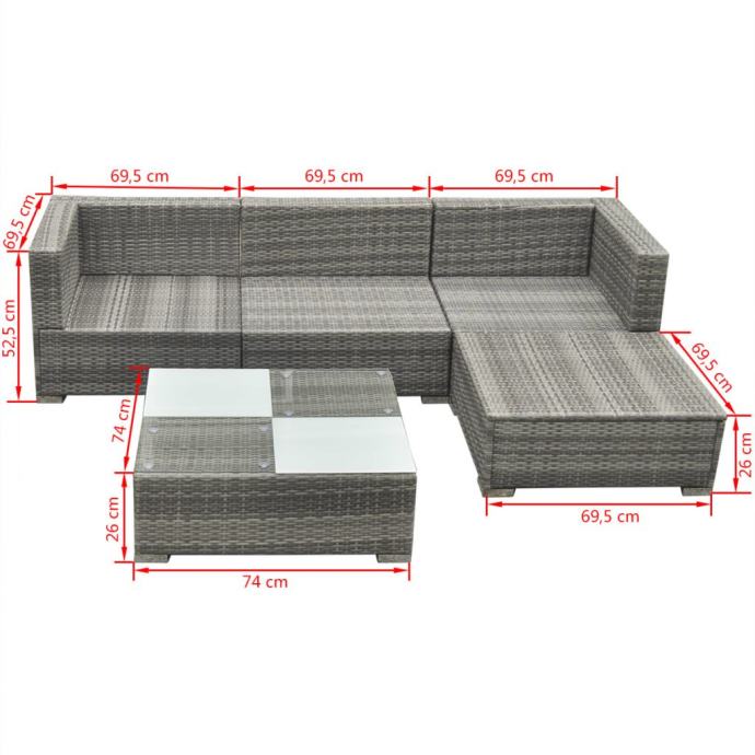 Isporuka uključuje 2 kutne sofe, 1 centralnu sofu, 1 otoman, 1 čajni stolić, 4 jastučića za sjedenje i 5 jastučića za naslon. Napomena: Preporučujemo da prekrijete namještaj za vrijeme kiše, snijega ili mraza.
