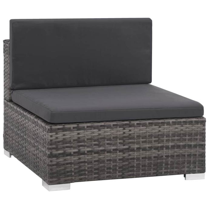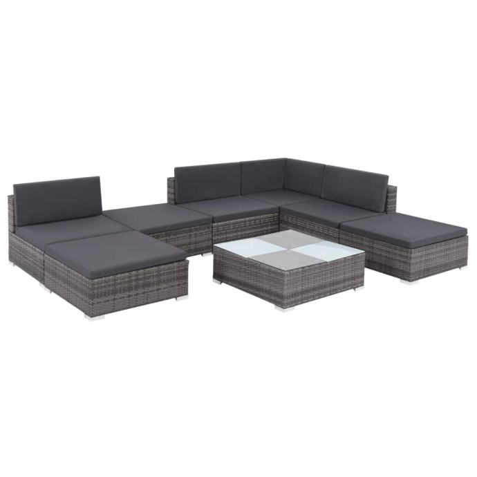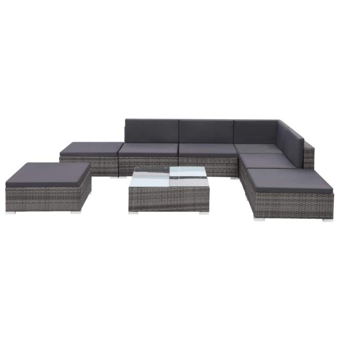 Ova garnitura od poliratana, koja se sastoji od 1 kutne sofe, 3 središnje sofe, 1 stolića za kavu, 3 taburea, 5 jastuka za naslon i 7 jastuka za sjedalo, pružit će elegantan prostor za sjedenje za vaš vrt ili terasu.