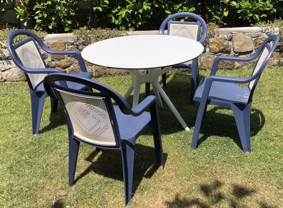 Vrtna garnitura za sjedenje, Stol Dimenzije fi 90_ cm, Materijal: Ploča Kompakt, noge Polipropilen bijele, zaštita od UV (postojan i zadržava bijelu boju), Stolice PVC plastika u dvije boje, okvir plave boje, zadnji dio zaslona svijetlo bijele Kategorija: Stol A, Stolice C, Art.No. P2002