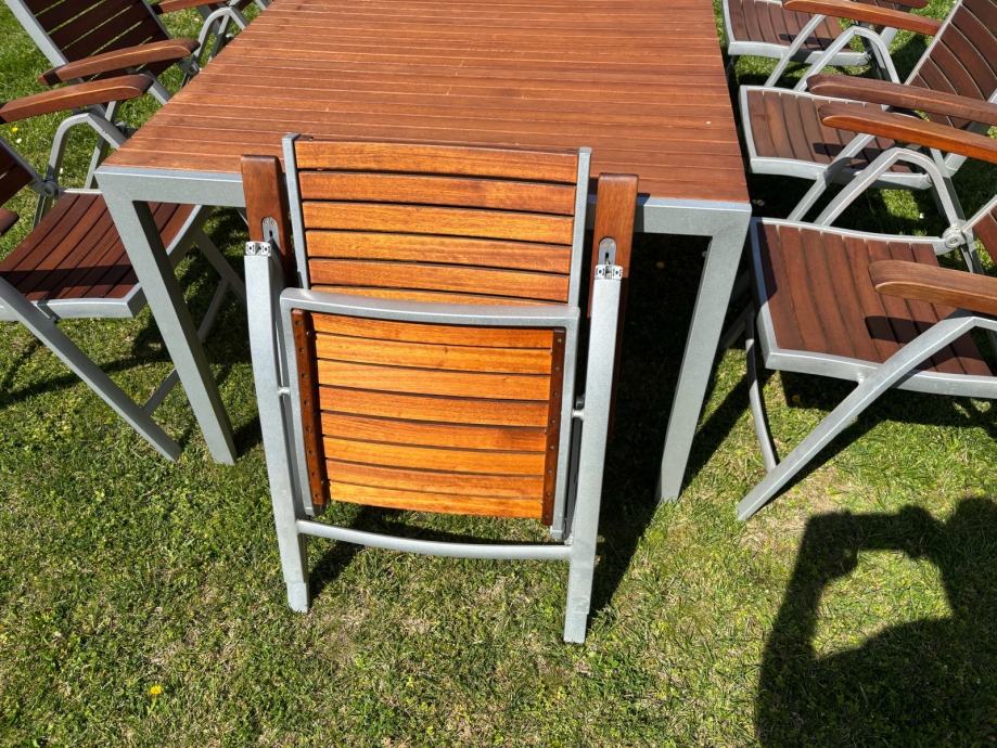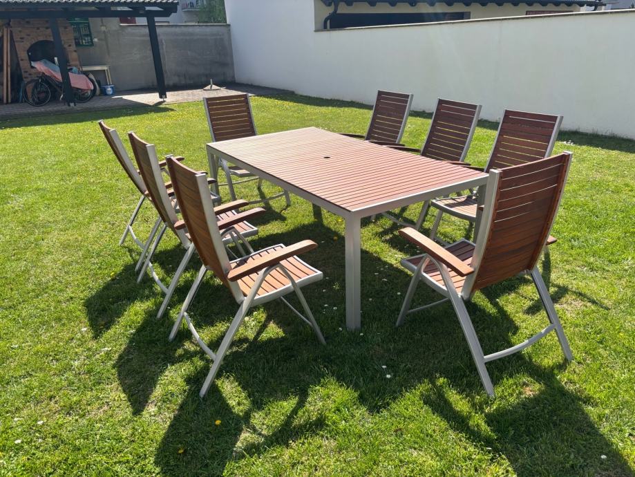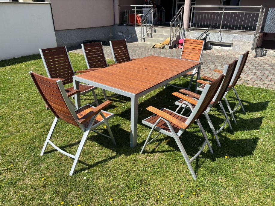Prodajem kvalitetnu vrtnu garnituru u odličnom stanju, koja se sastoji od stola i 8 stolica sa jastucima. Kombinacija pravo drvo i aluminiji, stol je 210x110. Sve je u super stanju i očuvano, kao što se vidi na slikama. Svaka stolica ima svoju kutiju i preko zime je sve bude spremljeno u garažu.