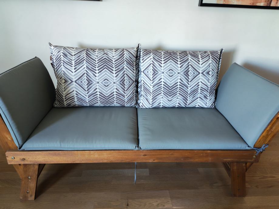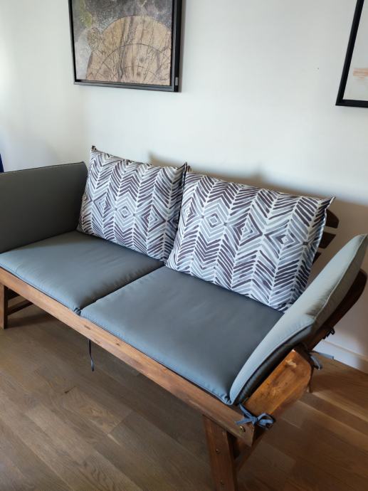 Prodajem klupu za vrt, balkon u odličnom stanju. Od bagrema, natur boje. Jastuk za sjedenje sive boje + dva jastučića sive boje sa mustrom. Navlaka jastučića se može skinuti. Visina 78, širina 150, dubina 60.