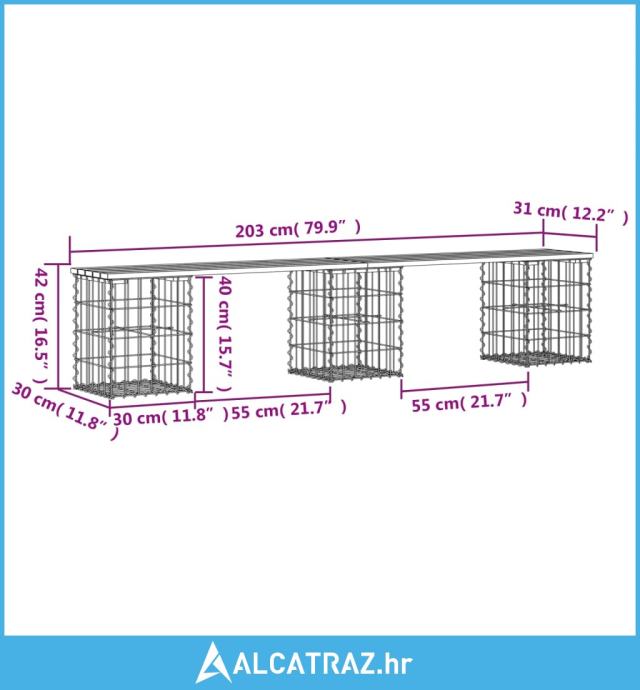 - Čvrsta i stabilna baza: Ova vanjska klupa ima bazu od gabionske košare od pocinčanog čelika koja je dizajnirana za punjenje kamenjem i šljunkom za dodatnu ljepotu. Mrežasta rešetka gabionske košare zavarena je poprečnim i uzdužnim žicama na svakom križanju za dodatnu stabilnost.