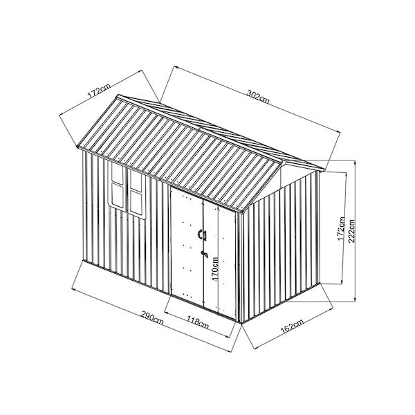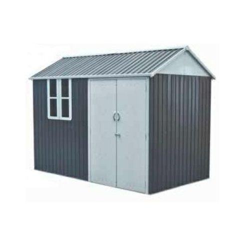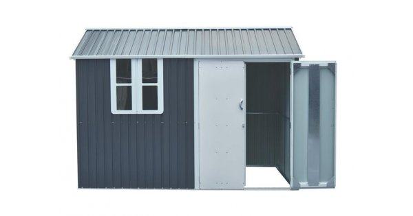Vrtna kućica visoke kvalitete s izdržljivom pocinčanom konstrukcijom u kombinaciji sive i tamno sive boje. Njegov otisak od 1620 x 2900 mm (vanjske dimenzije osnovice) omogućuje skladištenje svih alata, sitne vrtne opreme i ostalog vrtnog materijala koji treba održavati suhim.