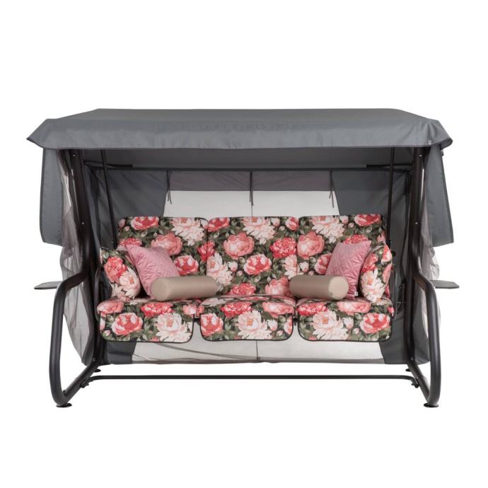 Vrtna ljuljačka opremljena je s 3 jastuka za sjedenje s naslonima, koji pružaju veliku udobnost tijekom korištenja. Osim toga, komplet upotpunjuju 2 mekana i udobna naslona za ruke. Na okvir se pričvršćuju pomoću čičak trake. Osim toga u kompletu se nalaze 2 ukrasna jastučića (jastučića).