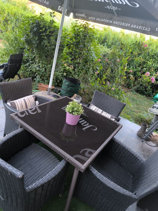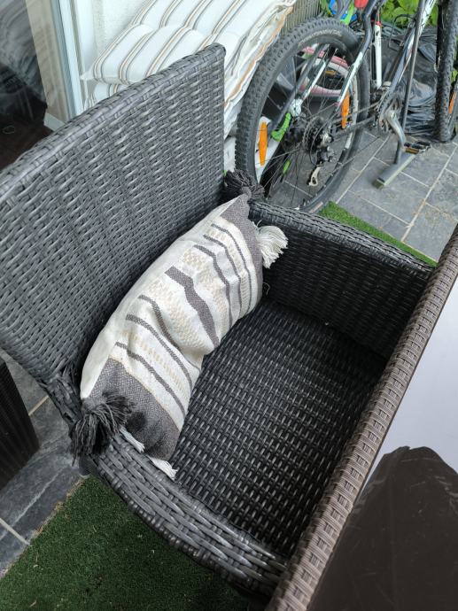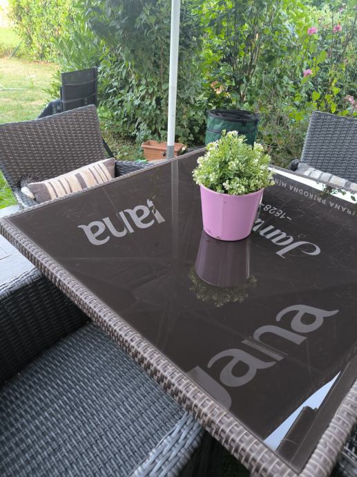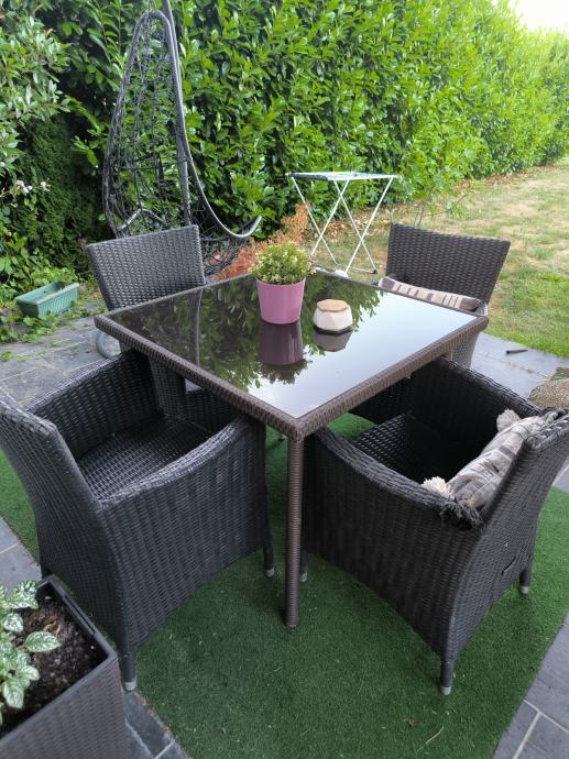 Tamno siva ratan garnitura. 4 stolice i stol sa tamnim staklom.