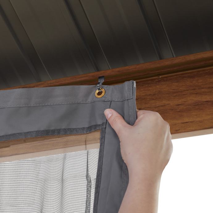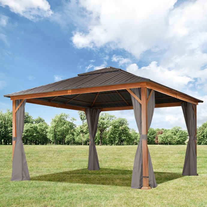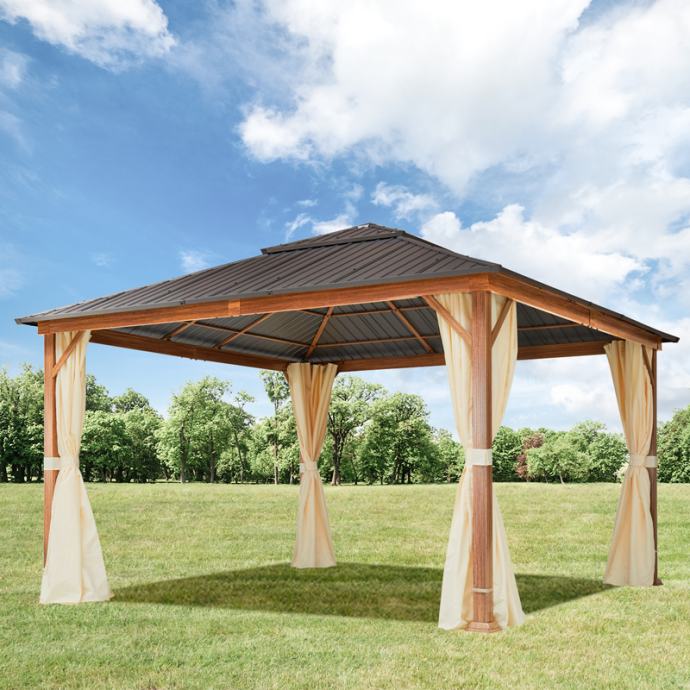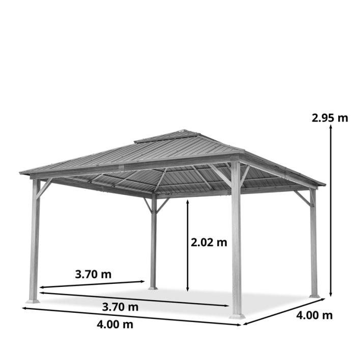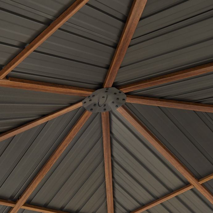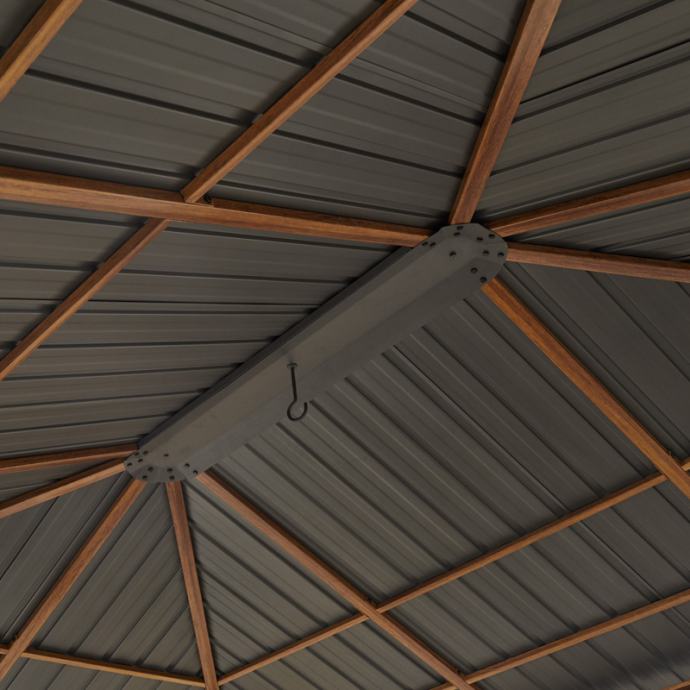 Čvrsti čelični krov savršeno štiti sjenicu Superior od lošeg vremena. Krov paviljona prkosi kiši i snijegu. Zbog velike vlastite težine čelika, čelični krov uvjerava visokom razinom stabilnosti. To zauzvrat uspješno prkosi vjetru i vremenu i čini ovaj paviljon idealnim za sve godine. Za razliku od vrhunskih vrtnih sjenica s krovom od cerade, ova sjenica može ostati u vašem vrtu tijekom cijele godine.