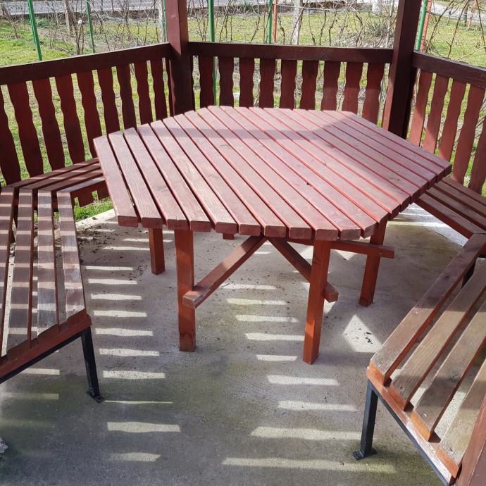 prodajem vrtnu sesterokutnu sjenicu,pokrivena je sindrom,stupovi i grede su hrastove a krov je jelov.u sjenici se nalazi stol i klupa za sjedenje 10 ljudi.sjenica je u odlicnom stanju
