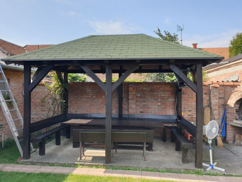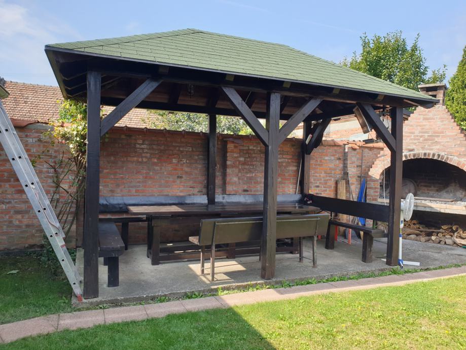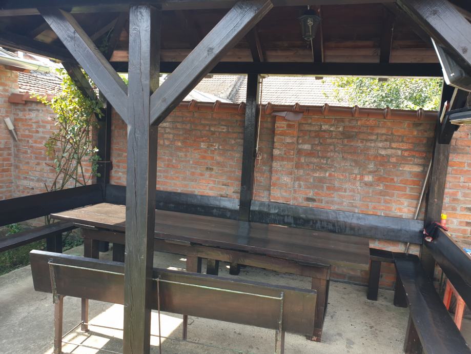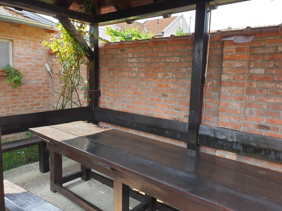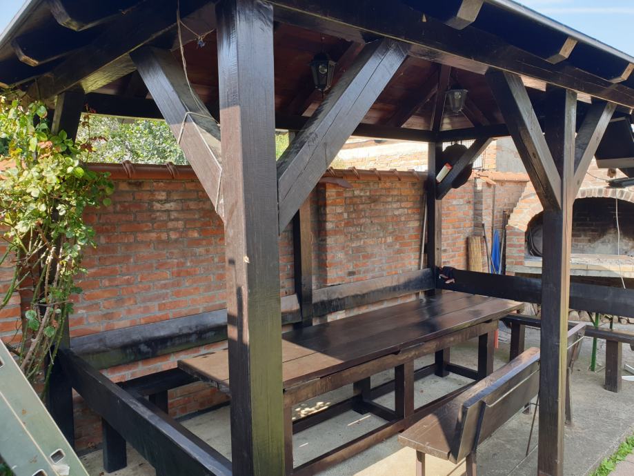Prodajem vrtnu sjenicu sa klupama i stolom za 15-20 osoba u odlicnom stanju, kao nova. Sjenica, klupe i stol su rucni rad,pravljeno po mjeri od punog drveta.