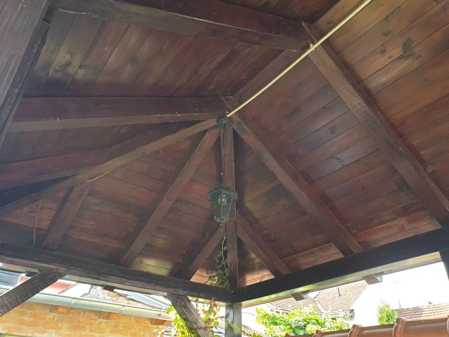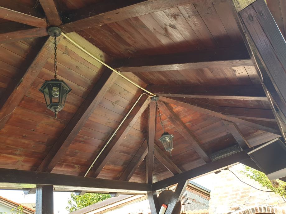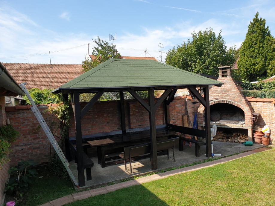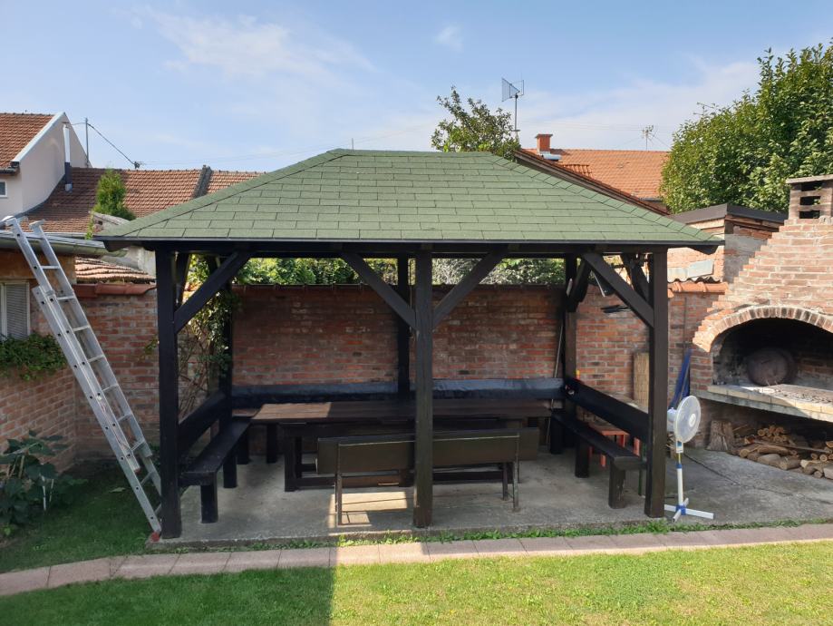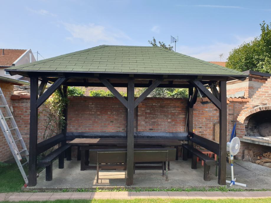 Prodajem vrtnu sjenicu sa klupama i stolom za 15-20 osoba u odlicnom stanju, kao nova. Sjenica, klupe i stol su rucni rad,pravljeno po mjeri od punog drveta.