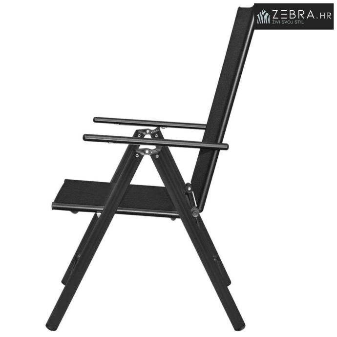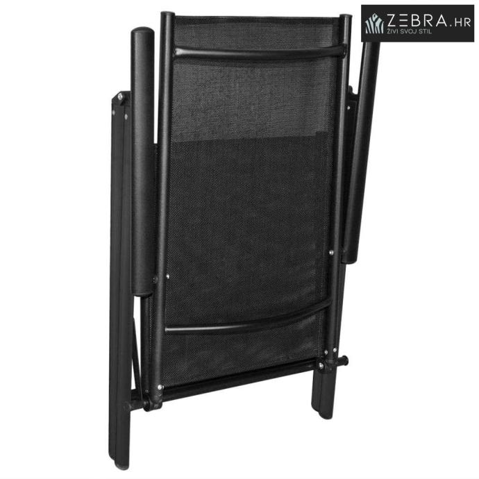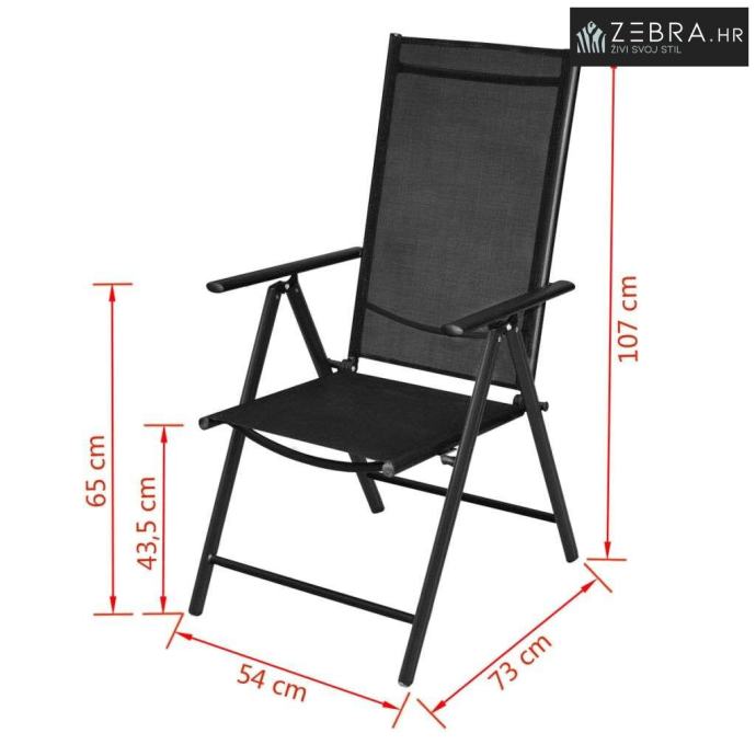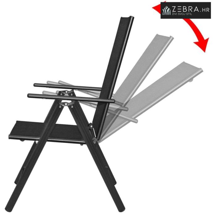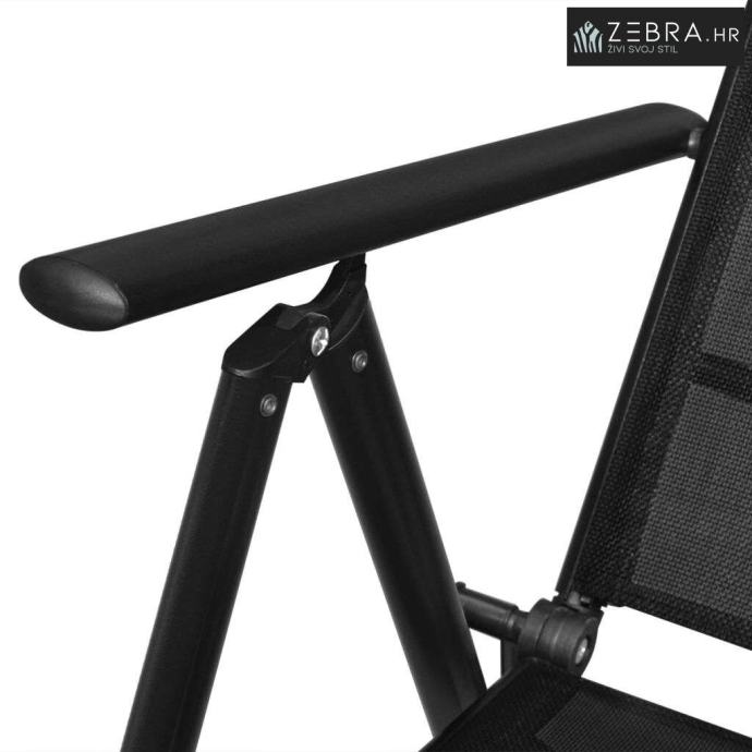 Okvir od aluminija obložen prahom, čini stolice vrlo čvrstim i izdržljivim. Vrtne stolice su mekane na dodir, tekstilen je otporan na atmosferske utjecaje i mogu se podesiti u 7 pozicija,da uvijek možete pronaći najudobniji položaj za sjedenje. Zahvaljujući lakoj konstrukciji,stolice mogu biti jednostavno premještane. Možete ih preklopiti radi uštede prostora kada nisu u uporabi.