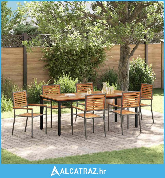 Ovaj prostrani vrtni blagovaonski set osigurava elegantno rješenje za obroke na otvorenom. Savršen je za veća okupljanja na terasama ili balkonima. Sa stylish kombinacijom sive metalne i prirodnog drva, idealan je za one koji traže praktično rješenje za vanjske događaje.