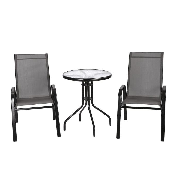 Ova 3-dijelna vrtna garnitura je savršena za manje prostore npr. balkon, terasa ali i za vrt. Garnitura se sastoji od dvije stolice i stola s površinom od kaljenog stakla. Izrađena je od čvrste i postojane čelične konstrukcije što je čini otpornom na vremenske utjecaje, UV postojana. Praktičnih dimenzija pruža dovoljno prostora za uživanje u finom obroku ili jutarnjoj kavi.