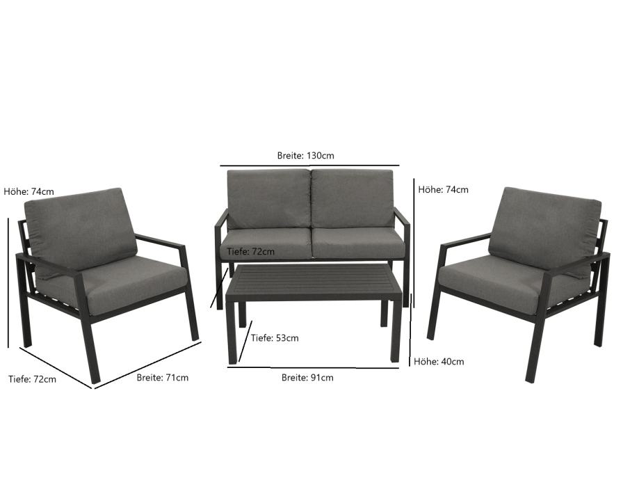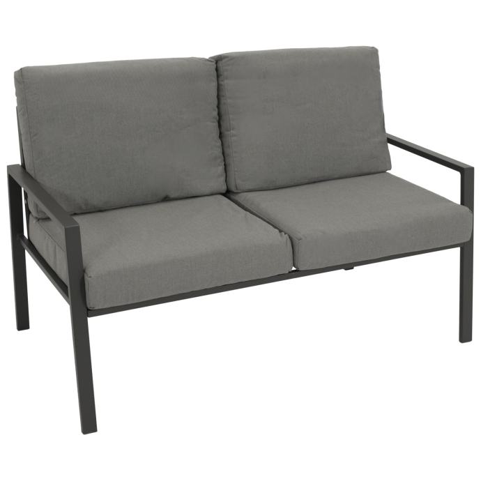Napravljen od aluminija otpornog na vremenske uvjete, ovaj lounge set je otporan na hrđu, stabilan je i posebno izdržljiv. Izdržljiva presvlaka u elegantnom sivom tonu (260 g/m²) osigurava visoku udobnost sjedenja i idealna je za vanjsku upotrebu. Čak i na manjim površinama kao što su balkoni ili kompaktne terase, ovaj set nudi maksimalnu udobnost u minimalnom prostoru.