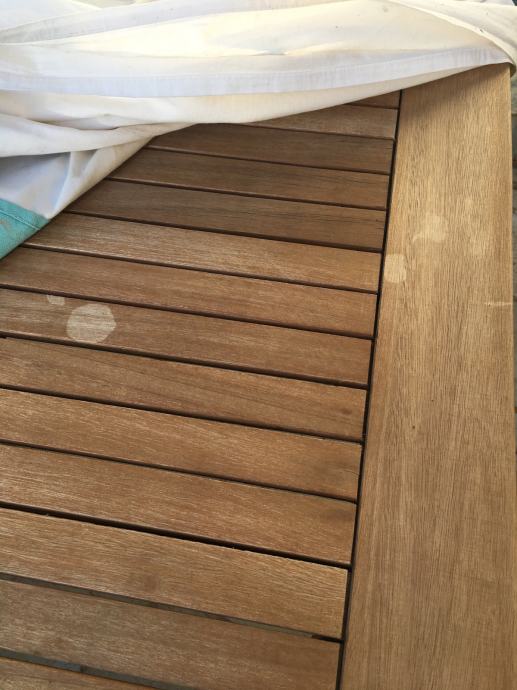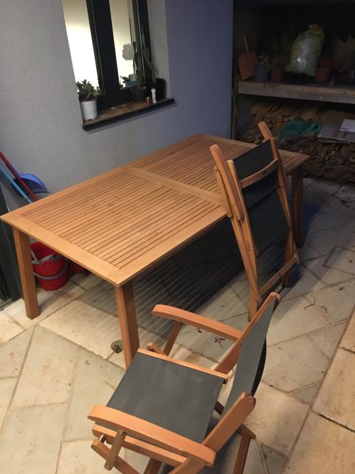 Prodajem vrtnu garnituru: stol+6 stolica. Kupljena je u Lesnini u 6.mjesecu za 3,600kn na sniženju. Sada bi ta kombinacija došla 4,900 (ovo je stol- https://www.xxxlesnina.hr/p/ambia-garden-stol-vrtni-natur-drvo-002750003907,). Prodajem da vratim barem dio investicije jer neće izdržati riječke kiše (skužila sam da nije za van, a nemam kamo s njom unutra). Vjerujem da je netko može spasiti (prebrusiti, prefarbati) prije nego meni na terasi propadne skroz. Stol je na rastezanje, a stolice se sklope. Stol ima oštećenja: par mrlja svijetlije bolje i jedna noga stola ima pukotinu nakon onih poplava (sve je na fotkama). Realna boja varira od crvenkasto-smeđe do svijetlo smeđe (najbolje se vidi na predzadnjoj slici). Na stolicama nema vidljivih oštećenja. Možete doći pogledati, za cijenu možemo pregovarati :)