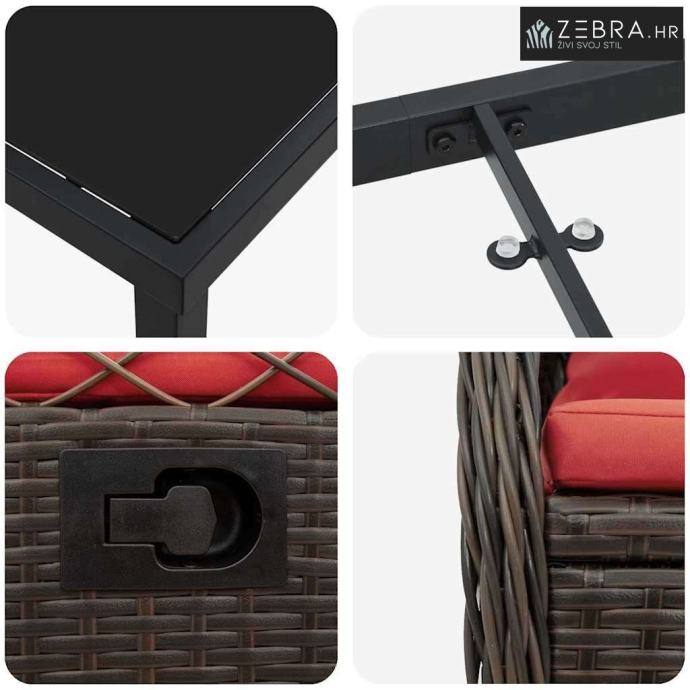 Materijali: Uglavnom od poliratana, ovaj set za objedovanje može podnijeti razne vremenske uvjete, što ga čini odličnim za ljeto. Stakleni vrh dodaje malo klase, savršeno se uklapajući u moderni izgled. Čvrsti čelični dijelovi daju stabilnu podlogu, pa ostaje stiliziran i uz redovitu upotrebu. Uključeni dijelovi: Dolazi s jakim čeličnim nogama koje jamče stabilnost, plus nasloni i sjedala od poliratana za dodatnu udobnost. Bilo da jedeš ili samo odmaraš, ovi dijelovi pružaju ugodno iskustvo miješajući funkcionalnost s opuštanjem. Podesivost: Višenamjenski nasloni omogućuju ti da postaviš kut po svom guštu za udobnost. Ova funkcija naglašava ergonomski dizajn, dajući ti personalizirano mjesto za opuštanje koje odgovara modernom stilu. Preporučena upotreba: Savršeno za terase i vrtove, ovaj set je idealan za vanjske obroke ili samo chillanje vani. Njegov moderan izgled poboljšava svaki vanjski prostor, bilo da organiziraš obiteljske večere ili mala okupljanja, nudeći fleksibilnost kroz cijelu godinu za tvoj vrt. Njega i održavanje: Da bi išao s vremenom, pokrij set kad ga ne koristiš, osobito u lošem vremenu. Držanje daleko od elemenata pomoći će da ostane privlačan i funkcionalan dugi niz godina. Boja: Smeđa