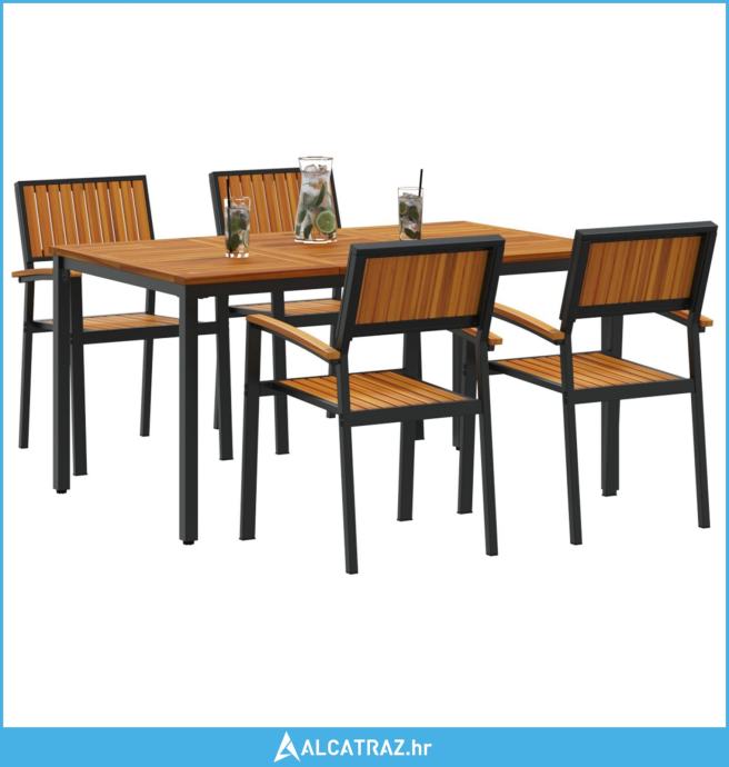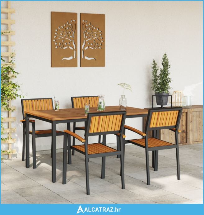 Ovaj set za objedovanje u vrtu od 5 dijelova sjajno spaja snagu metala s prirodnim šarmom drva akacije, i izgleda odlično u svakom vanjskom prostoru. Idealno je za obiteljska okupljanja ili zabave s prijateljima, donoseći svjež i moderni izgled dok je funkcionalan i čvrst.