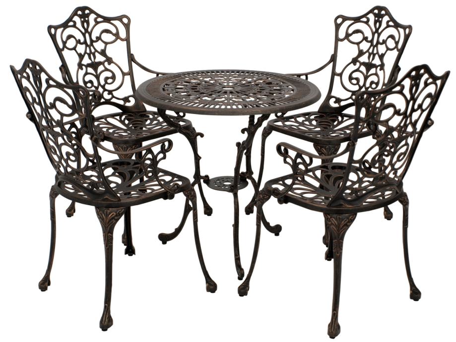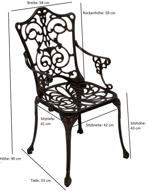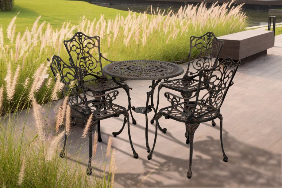 Svi dijelovi presvučeni su antičkom broncom. Svojim elegantnim izgledom garnitura je dragulj za svaki vrt - bilo kao udobno sjedalo ili samo kao atraktivan ukrasni element.