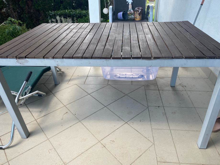 Prodajem vrtni stol dimenzija 90x150 cm. Stol ima drvenu ploču tamnosmeđe boje s letvičastom konstrukcijom te metalne noge svjetlosive boje. Čvrste je i stabilne izvedbe, prikladan za terasu ili vrt.