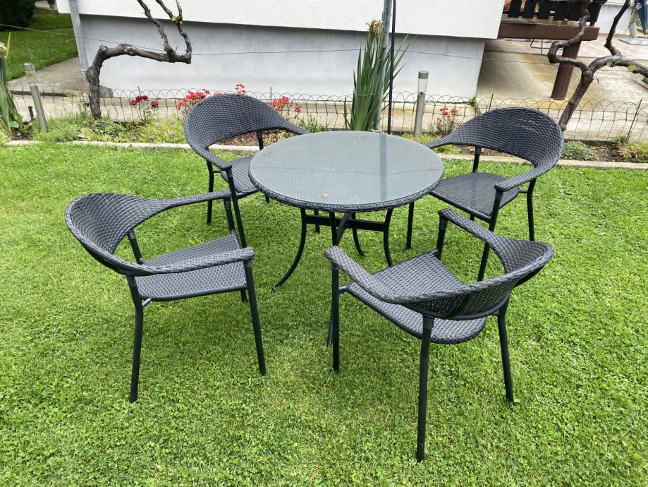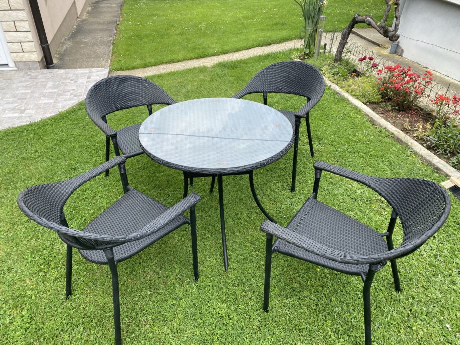 Stol promjera 80 cm, visina 72 cm. Melal i umjetni ratan, staklena ploča. 4 stolice, metal i umjetni ratan.