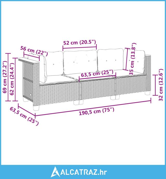 - Ukupne dimenzije sofe: 190,5 x 63,5 x 62 cm (Š x D x V)
