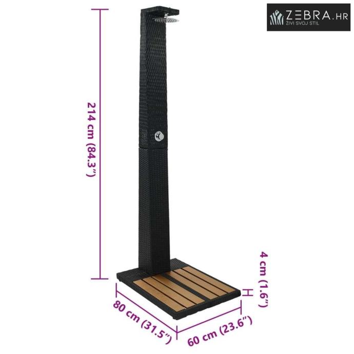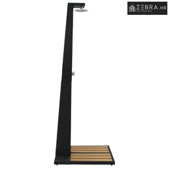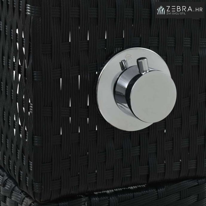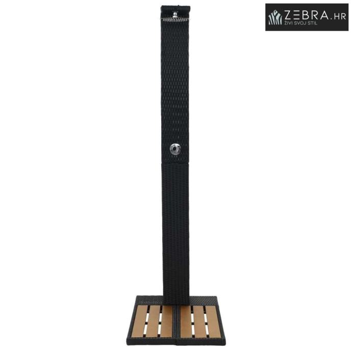 Stup tuša sastoji se od čeličnog okvira obloženog prahom i obložen je PE ratanom, materijalom poznatim po svojoj eleganciji i otpornosti na vanjske uvjete. Pod je izrađen od WPC-a, inovativnog kompozita koji spaja ljepotu drva s izdržljivošću plastike, što ga čini idealnim za vlažna okruženja. Oba materijala osiguravaju da je vrtni tuš otporan na sunce i kišu, što garantira dugogodišnju upotrebu bez propadanja ili blijeđenja. Crna i smeđa boja daju mu sofisticiran i prirodan izgled koji se lako uklapa u bilo koji stil vrta.