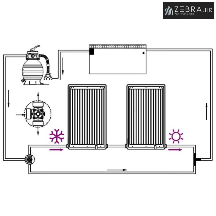 Ovaj solarni grijač bazena idealan je za nadzemne bazene. Zagrijava vodu u bazenu koristeći se sunčevom energijom.